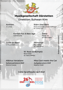 Suhwan Kim, Jg. 1993 hat den “Master of Music” an der Jeonbuk National University in Jeonju (Südkorea) abgeschlossen. Derzeit absolviert Suhwan an der Hochschule der Künste in Bern (HKB) im Master-Studium in Music Performance Klassik den Master of Arts (MA) mit der Vertiefung “Dirigieren Blasmusik”.